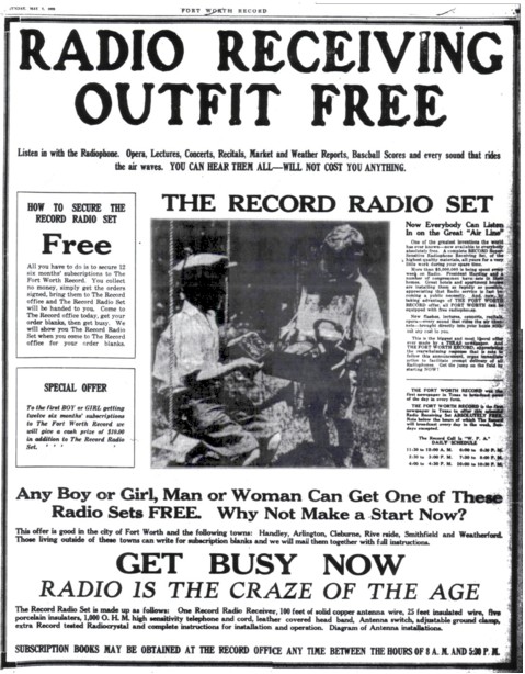 1922 was the year that radio truly exploded onto the scene, around America and in Dallas and Fort Worth. Whereas there had only been one broadcaster in the area before 1922, four more would soon join the local airwaves. And while the fire and police calls would still emanate as necessary on WRR, the entertainment and music portions of the programming soon found specific hours. This was partly due to the stations new license, and partly due to the fact that WRR now had to share times other stations that were signing on. In 1922 there were only two frequencies on which broadcasters were allowed to operate: the original amateur wavelength of 360 meters (about 833 kHz) used for “general entertainment”, and 485 meters (about 619 kHz) which was to be used only for government reports (weather reports, crop information, etc.) In August 1922, 400 meters (about 750 kHz) was added. WRR, like most stations of the the time, was using rather crude, homemade equipment, so staying on an exact frequency was a rare occurrence. In fact, many operators would simply adjust their frequency up or down if they found they were being interfered with. Radio in 1922 was far from what we know it as today.